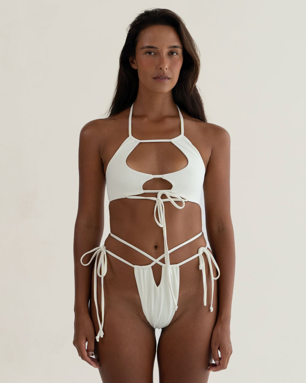 The multiple String Tie bikini. Featured with various cut outs, a double string tie bottom, and an uplifting effect top.