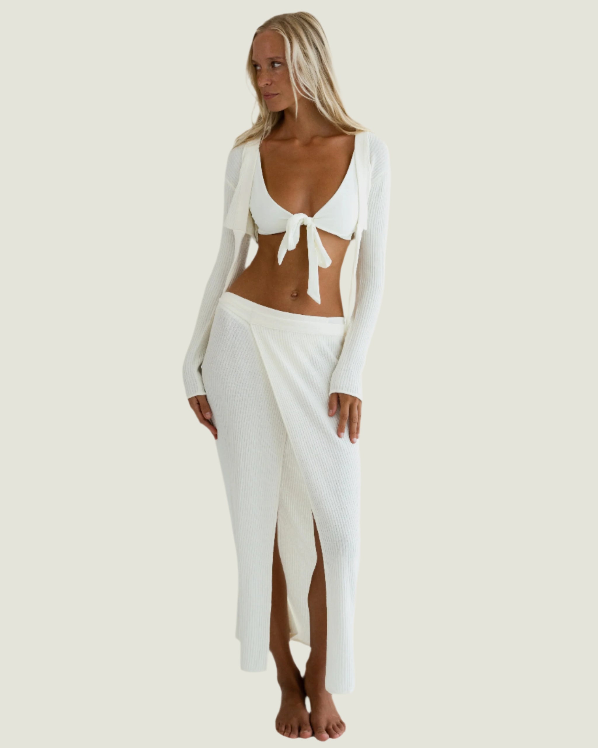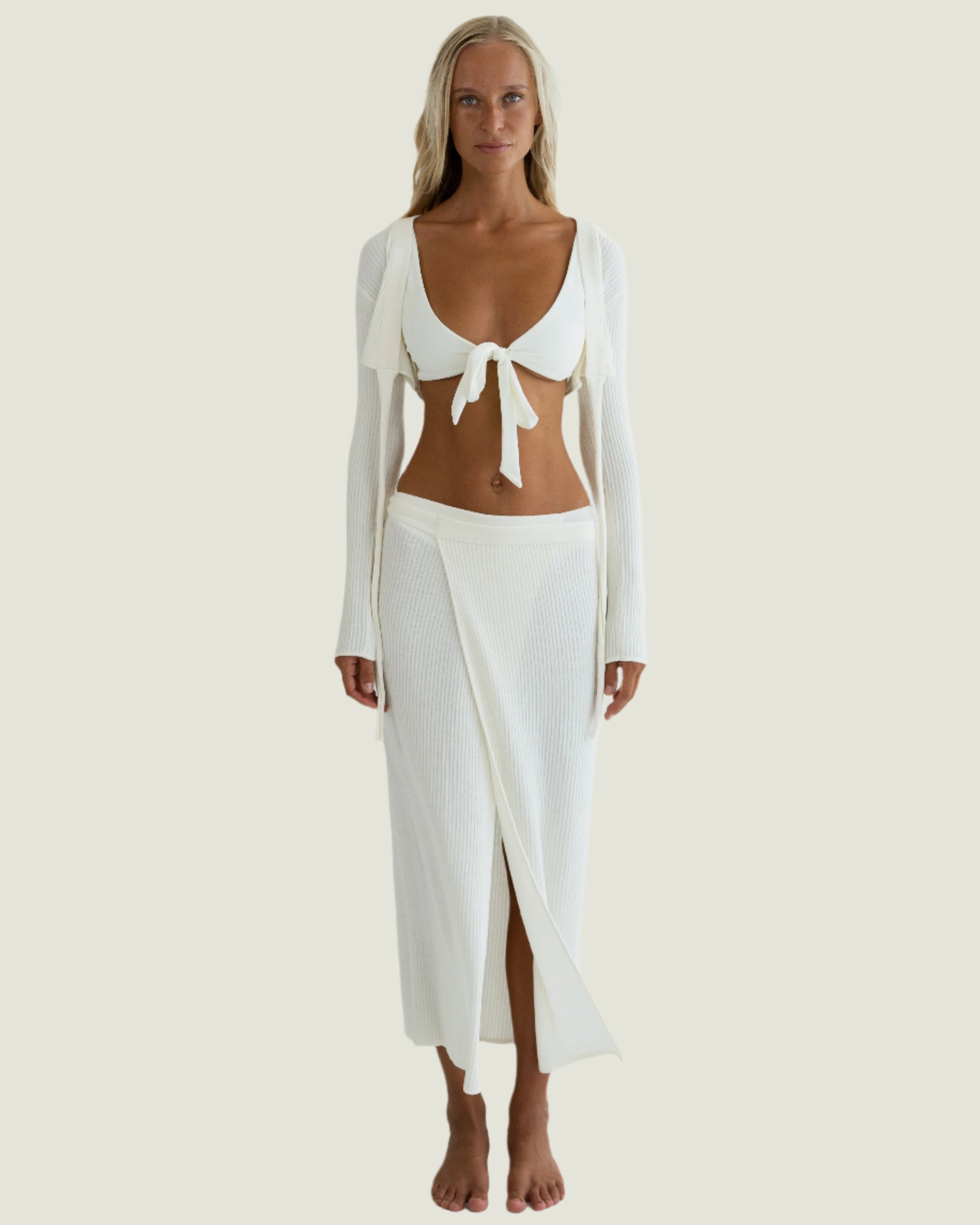 The versatile Long Skirt. A fitted ankle length skirt with a wrapped waist tie closure. Designed to be worn casual and chic, from boozy boat days to fancy dinner dates.