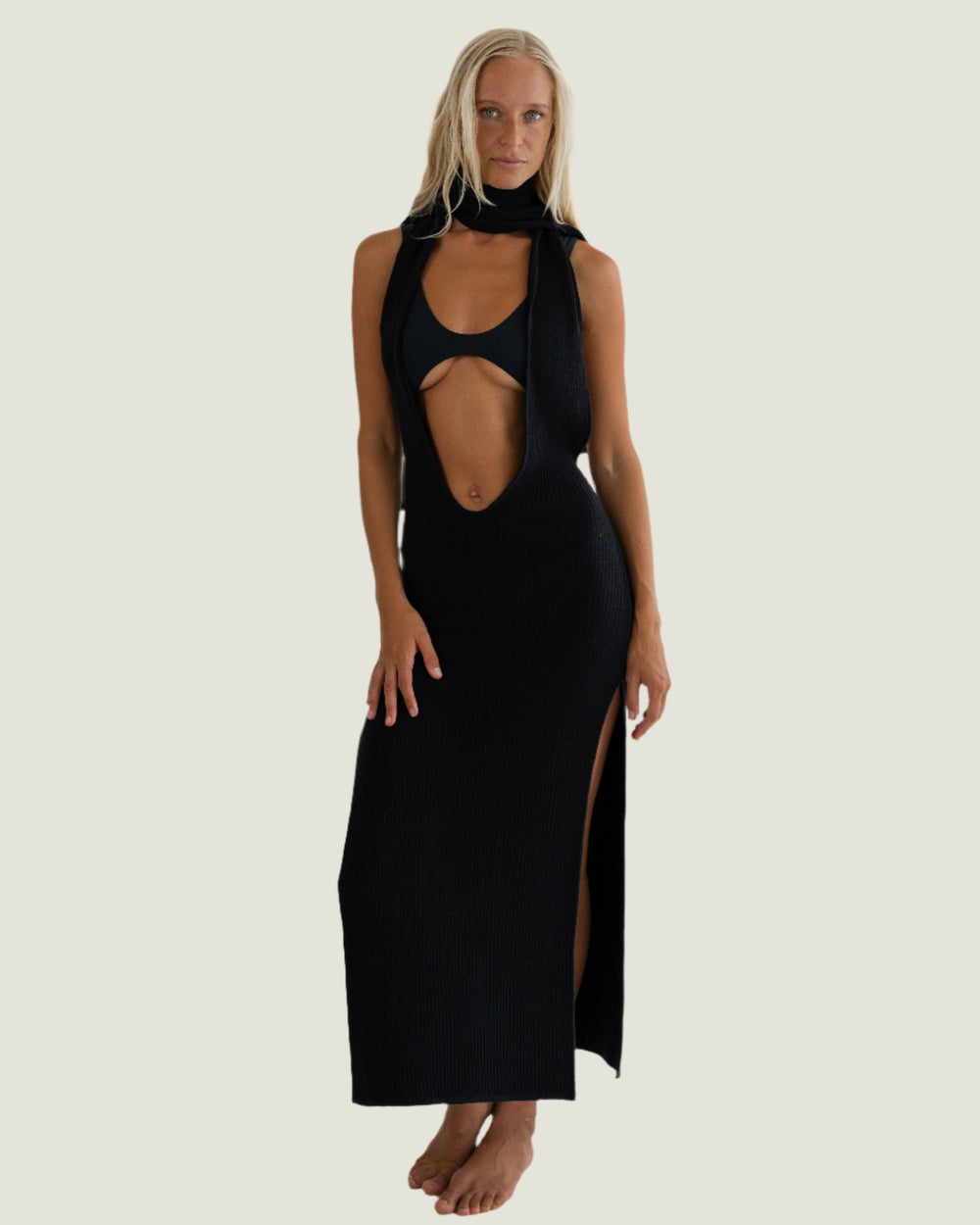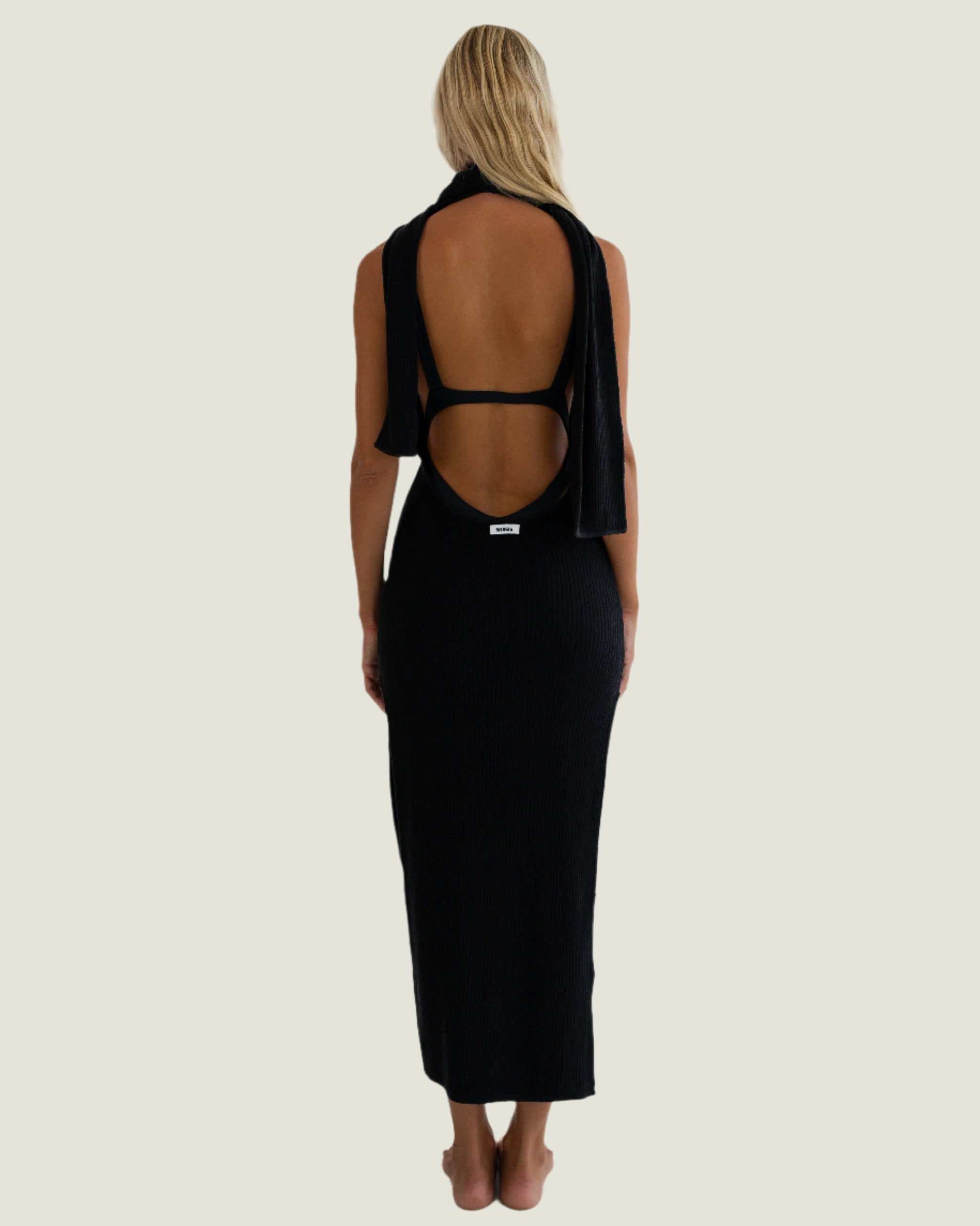 The iconic Scarf Dress. An ankle length dress with thigh high splits on both sides. Featuring a scarf detail, bare back and an ultra deep V neckline.